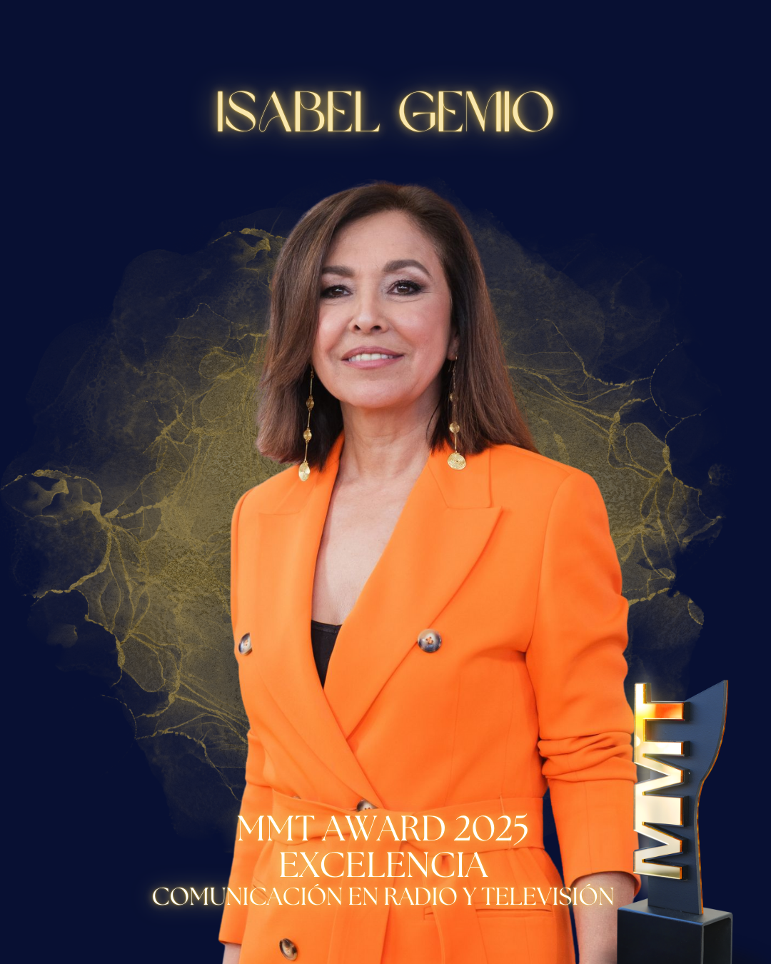Por su talento excepcional, su carisma inconfundible, y por llevar la comunicación en radio y televisión al máximo nivel, es un placer entregar el MMT Award 2025 en la categoría Comunicación en Radio y Televisión a Isabel Gemio.