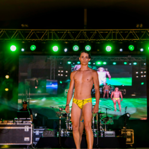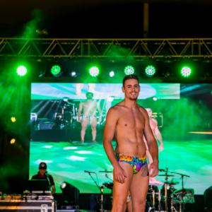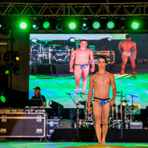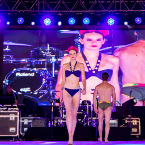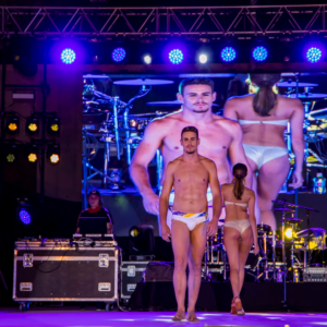 El público asistió a un desfile centrado en la moda de baño masculino y femenino, así como de ropa de vestir.